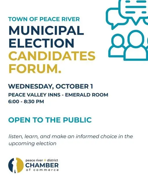 Hosted by the Peace River & District Chamber of Commerce, this public event offers residents a chance to hear directly from local candidates, ask questions, and learn about their platforms ahead of the upcoming municipal election.