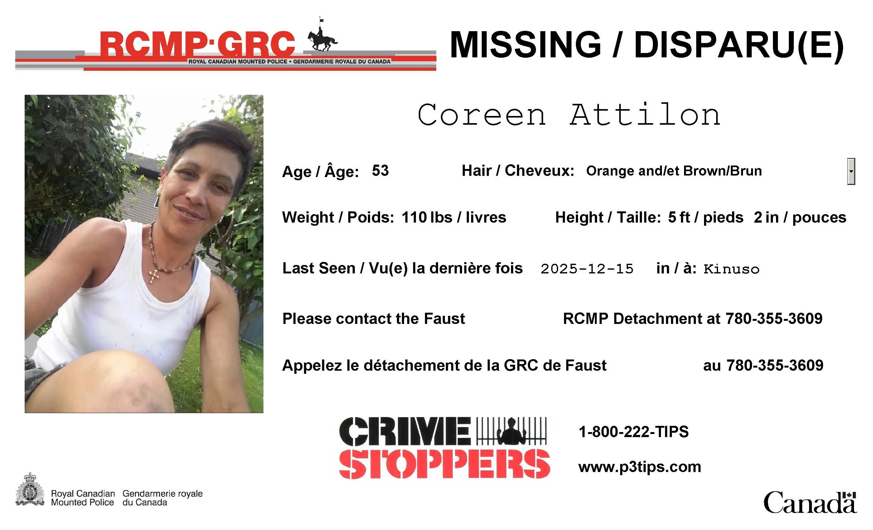 Police are searching for 53 year-old Coreen Annette Attilon of Slave Lake.