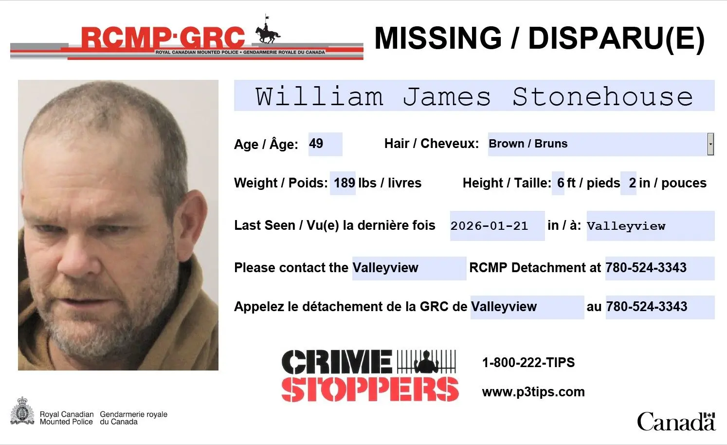 Valleyview RCMP are seeking public assistance in locating 49-year-old William “Billy” Stonehouse, last seen on January 21, 2026, in Valleyview, Alberta.
