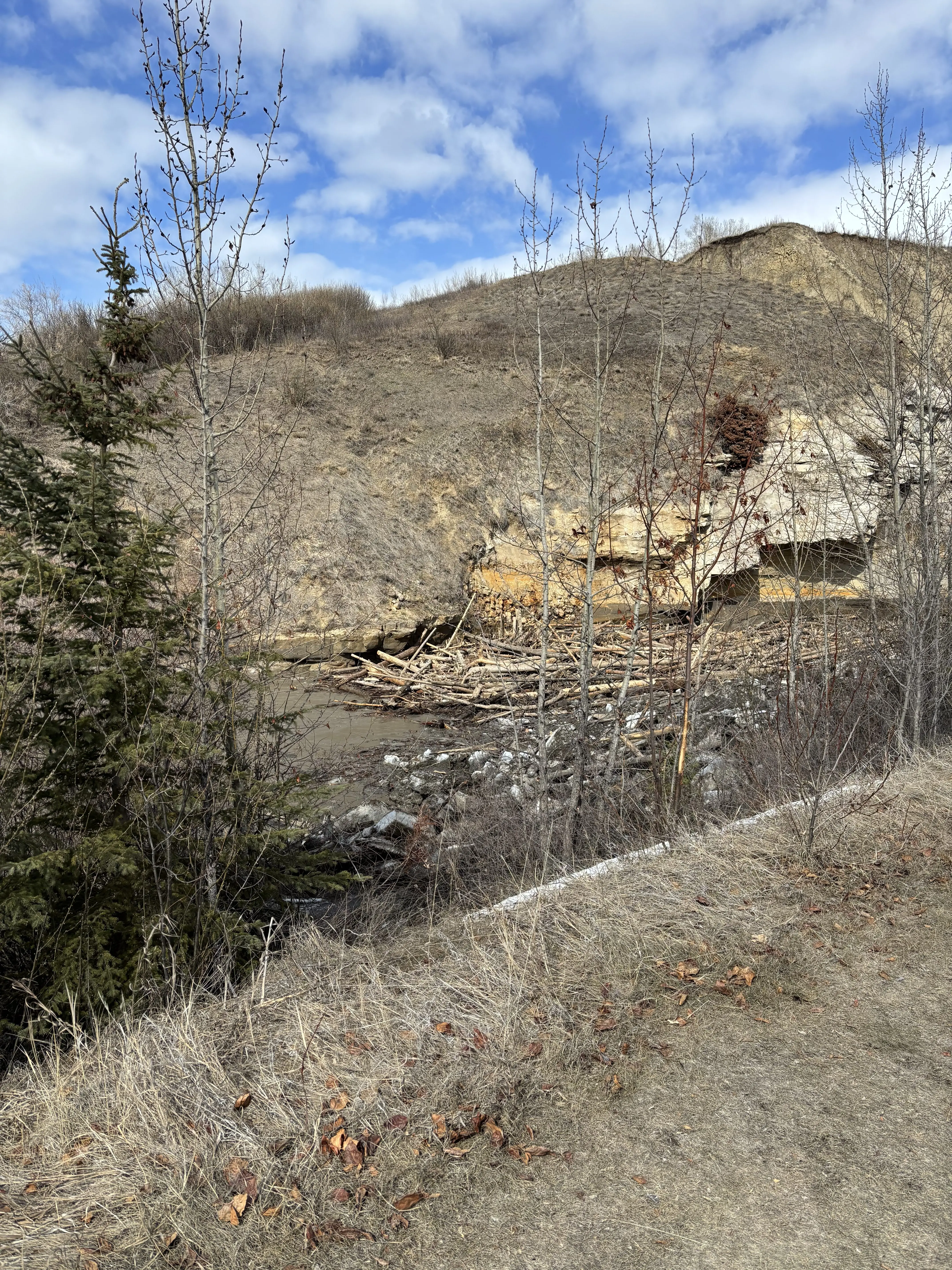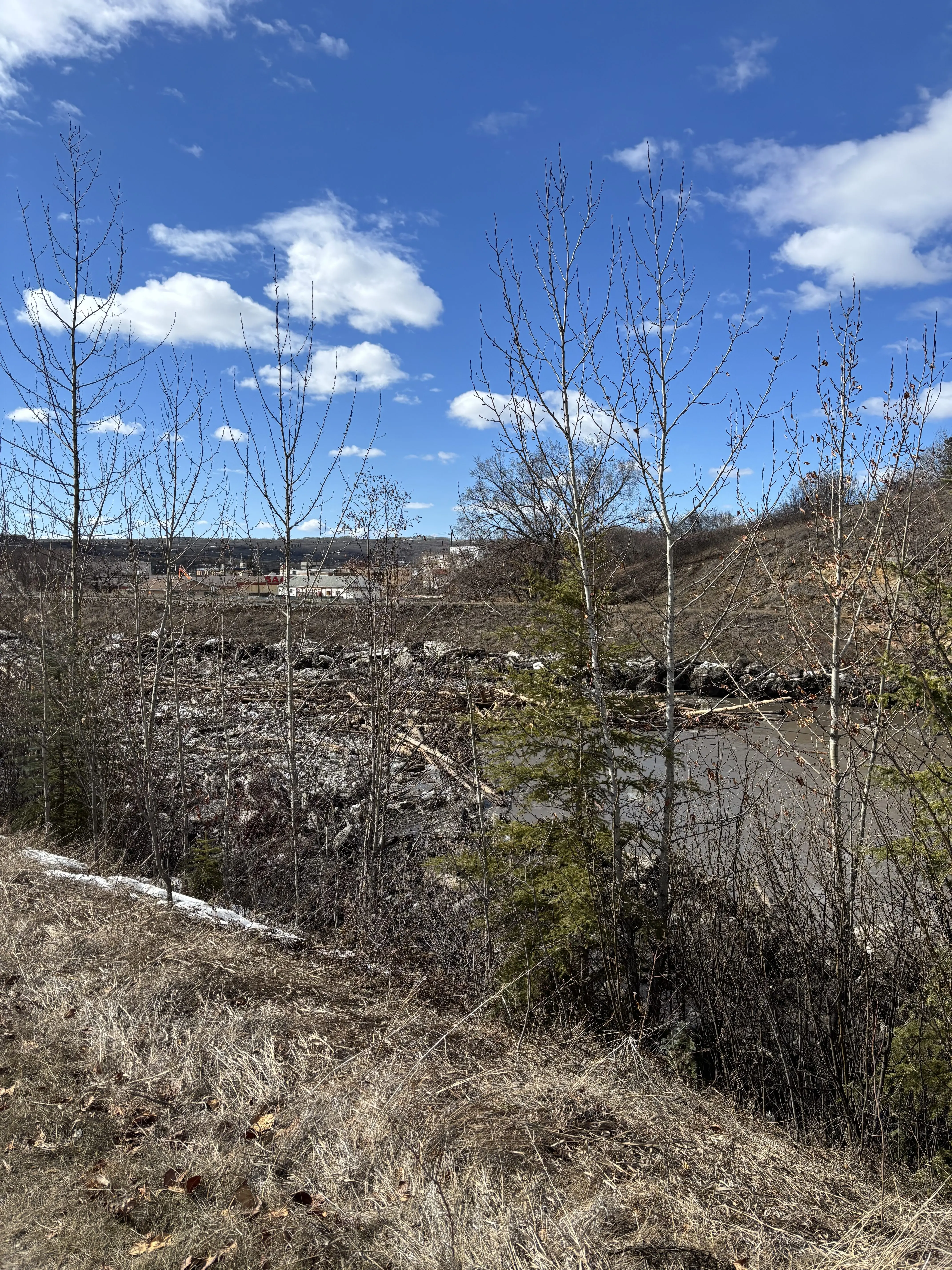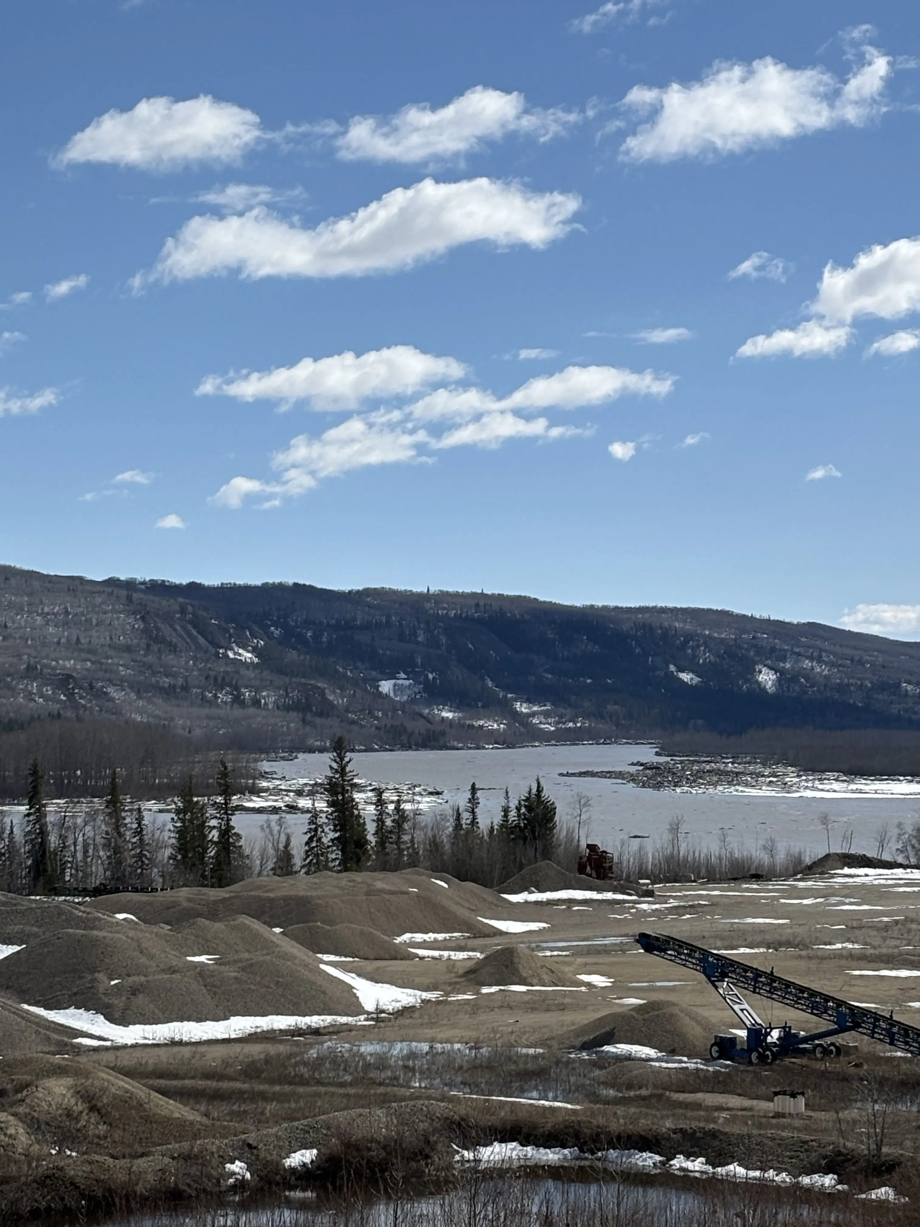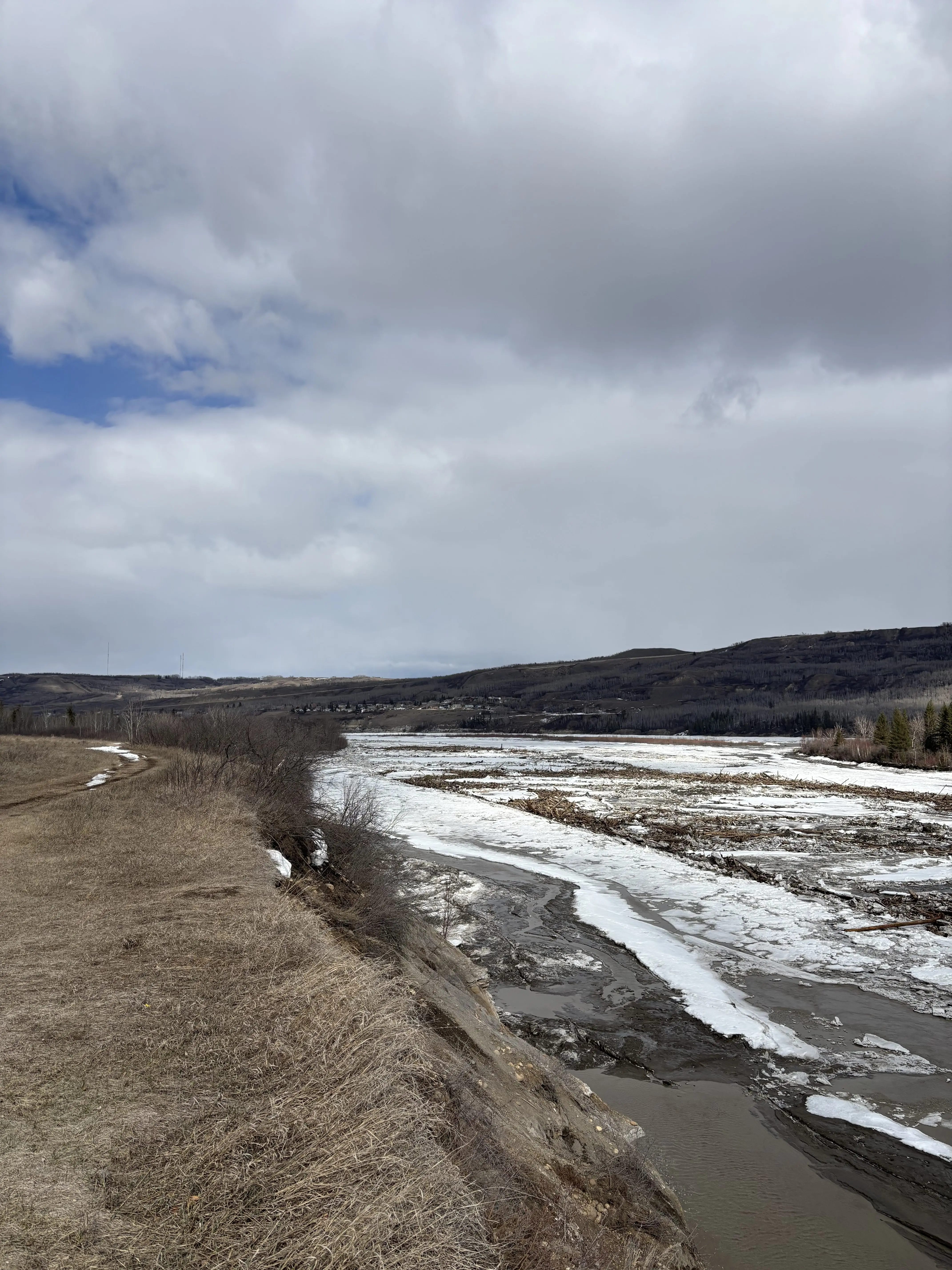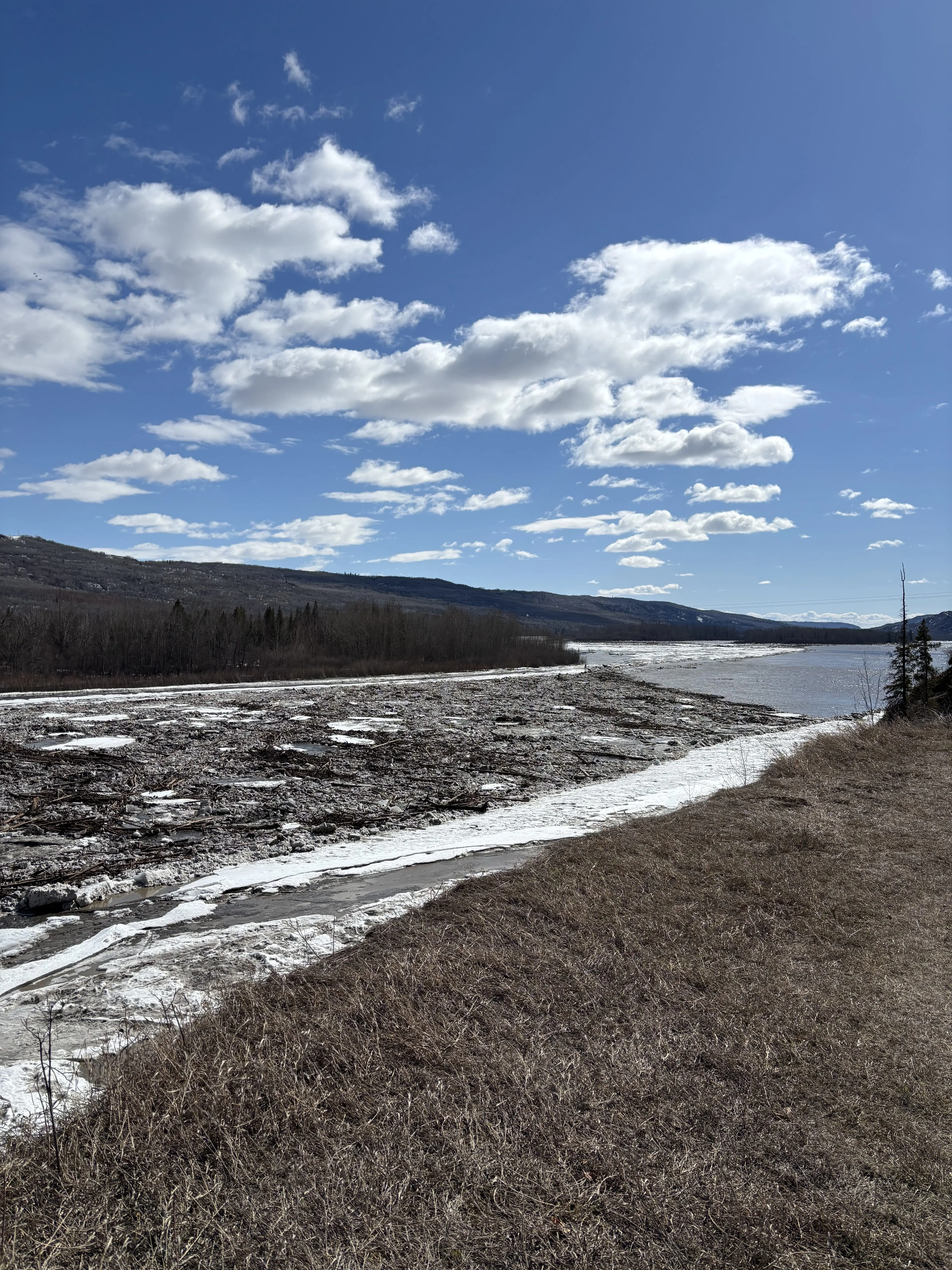 Meanwhile, the Peace River ice front is gradually moving toward town through a thermal breakup. Open water channels are forming as the ice weakens. The front is expected to fully pass through town by tomorrow or early Monday.
