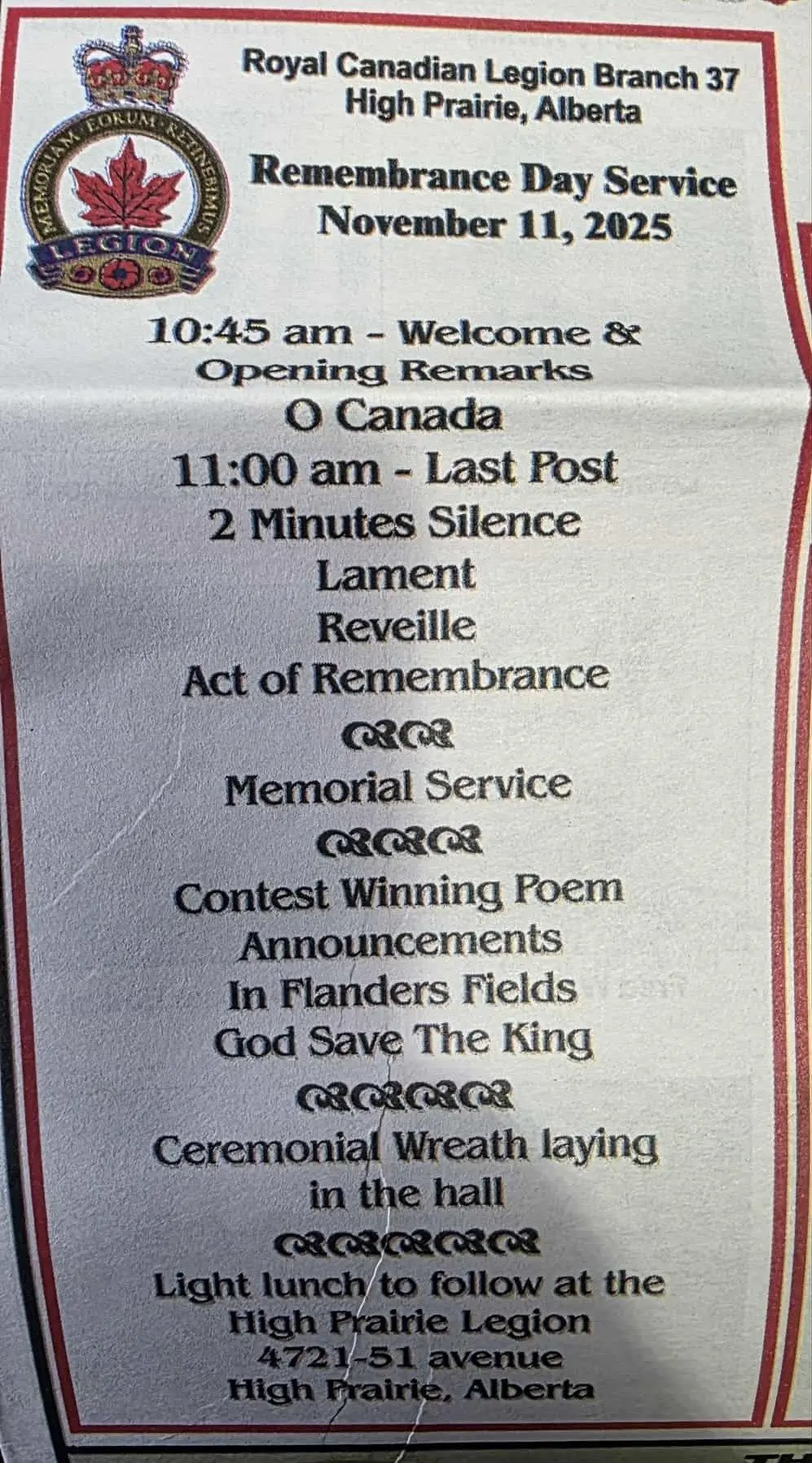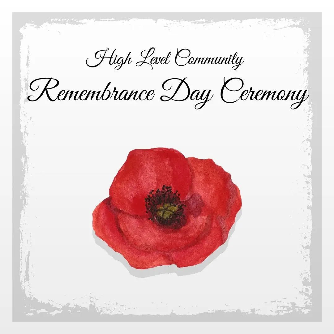 November 11 HIGH LEVEL REMEMBRANCE DAY CEREMONY Town of High Level Community Remembrance Day Ceremony Date: November 11 Start Time: 10:30am Location: High Level Public School Gymnasium (9701 105 Avenue)